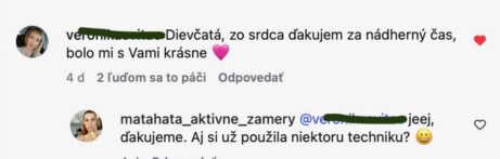 Ahojte dievčatá, ďakujem za workshop, ktorý mi otvoril nové obzory napr. v tom, že sa nemám upnúť na cieľ ale na proces jeho dosiahnutia. Že ten cieľ nemusí byť pre mňa to moje naj ale presne tá cesta k nemu. A naučila som sa, že myslieť občas len na seba nie je zlé…Ďakujem❤️